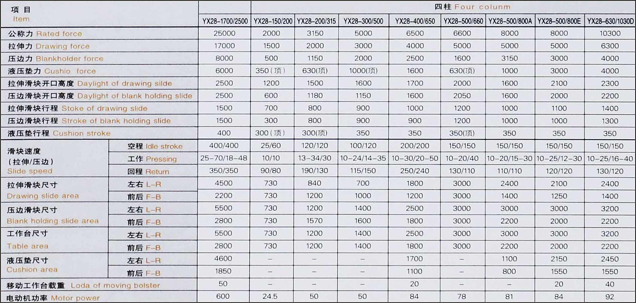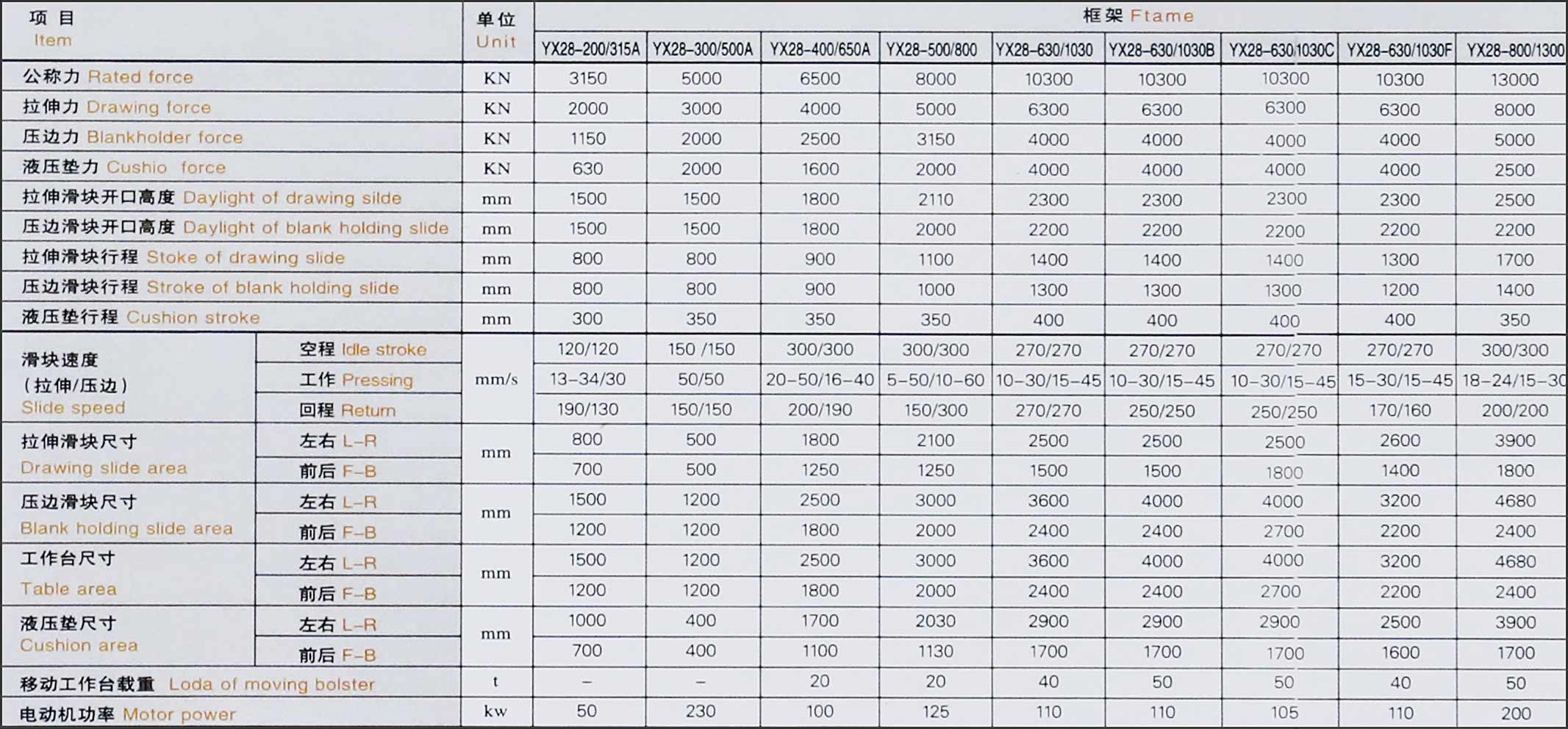 | 移動工作臺 | 沖裁緩沖裝置 | 壓邊滑塊,液壓墊死角分別調壓裝置(拉伸不對稱零件) | 光電保護裝置 | 換模用浮動導軌和滾動托架 |